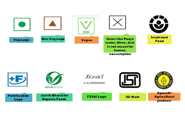 The symbols or logos on the food labels signify a particular standard or represent the true nature of the product. The few commonly seen symbols are the FSSAI logo along with the license number, veg/ non-veg logo, fortification logo on products that are fortified, food irradiation logo on products that have undergone the process of irradiation, Indian Organic logo, and Jaivik Bharath logo is seen on organic products. ISI mark certifies that the product conforms to the Standards which are laid by the BIS, Agmark symbol to assure that the agricultural products comply with the set standards.