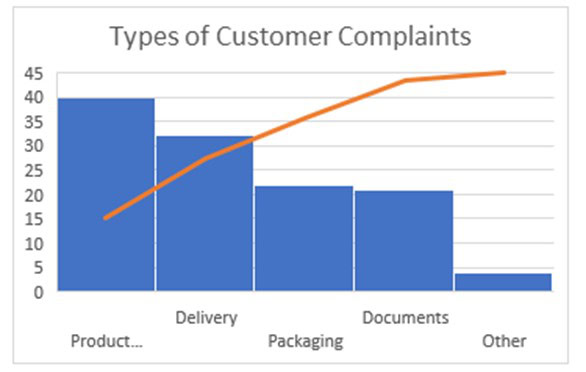The Pareto Chart is a series of bars whose heights reflect the frequency or impact of problems. On the Chart, bars are arranged in descending order of height from left to right, which means the categories represented by the tall bars on the left are relatively more frequent than those on the right.