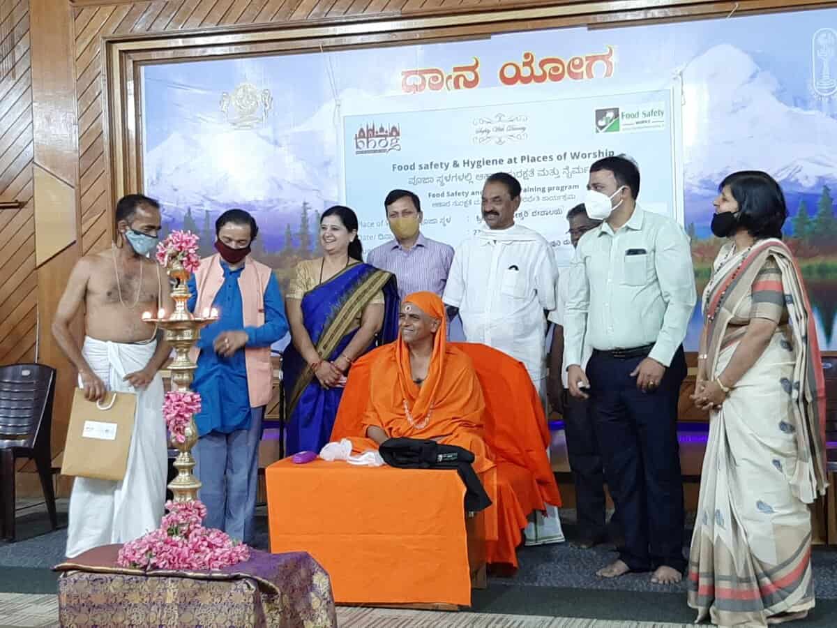 Food Safety Works, conducted the inaugural “Safety with Divinity” program at Rajarajeshwari temple on the 23.01.21. The program was inaugurated by H. H. Paramapujya Acharya Mahamandaleshwar Jagadguru Sri Sri Sri Jayendra Puri Mahaswamiji, Padasevaka Peethadhipati, from Sri Kailash Ashrama Mahasamsthana, Rajarajeshwari temple. The event was presided over by Ms. Sarika Agarwal, Managing Director Food Safety Works, in the presence of Mr. Dhanya Kumar Thaluk health officer, Bangalore South Thaluk, Bangalore Urban District.
