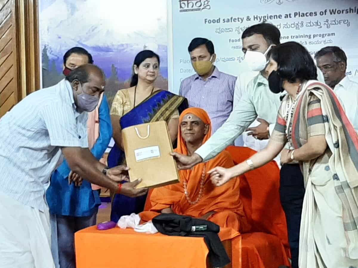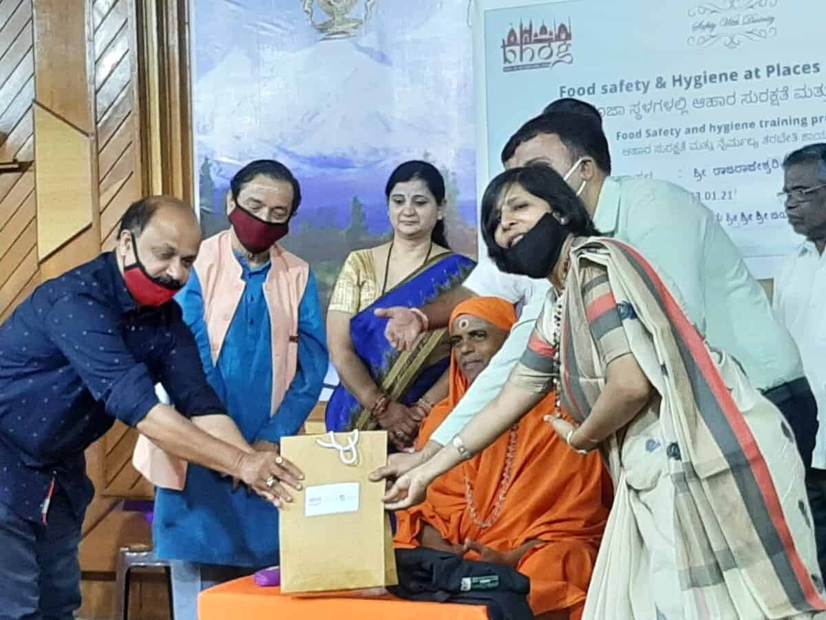 Food Safety Works, conducted the inaugural “Safety with Divinity” program at Rajarajeshwari temple on the 23.01.21. The program was inaugurated by H. H. Paramapujya Acharya Mahamandaleshwar Jagadguru Sri Sri Sri Jayendra Puri Mahaswamiji, Padasevaka Peethadhipati, from Sri Kailash Ashrama Mahasamsthana, Rajarajeshwari temple. The event was presided over by Ms. Sarika Agarwal, Managing Director Food Safety Works, in the presence of Mr. Dhanya Kumar Thaluk health officer, Bangalore South Thaluk, Bangalore Urban District.