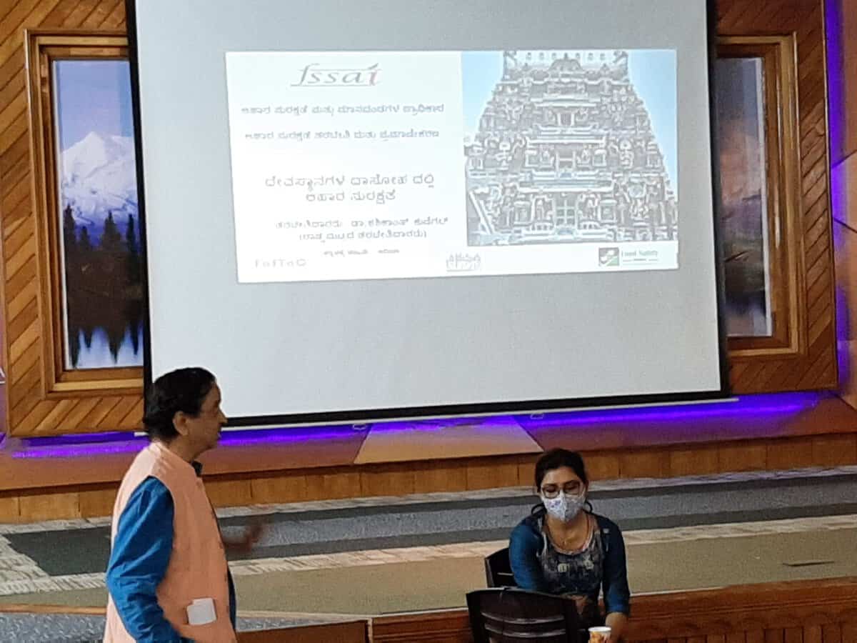 As part of the program, 20 food handlers were trained on food safety and each of them will receive a certificate from FSSAI for completion of the training. Hygiene kits, consisting of sanitizer, apron, masks, cap and gloves were also handed over to the food handlers. The training was conducted in kannada by Dr. Shashikanth Kunigal ( National Level Resource Person for FSSAI) who has conducted many training in catering and manufacturing for FSSAI. The training is part of BHOG program which is an initiative of FSSAI to train and implement food safety management system at places of worship. Dr. Shashikanth highlighted the importance of FSSAi’s stipulated guidelines for BHOG. The program was organized with the help of Mrs. Amita Pandey who has been a humble devotee of the temple for many years. Over all program was an enlightening experience for food handlers.