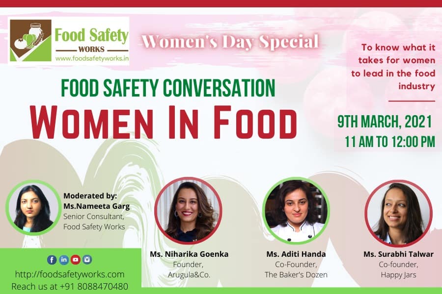Food Safety Conversation for the month of March 2021 is on the topic “Women In Food”. This will be held online on the 9th of March, 11:00 AM to 12:00 PM IST. In the conversation we look at the journey of some of the Women in the Food Industry and also talk about their experiences both good and bad and how they perceive the risks and rewards for being in the business. To discuss all this, we have some very prominent faces in the food industry as our panelists for the conversation. We have Ms. Niharika Goenka, founder of Arugula & Co, a health food startup that has a single point agenda, to help you #eatmoreveggies, Ms. Aditi Handa co-founder of Baker’s Dozen, a company that openly prophesies their love for sourdough, the pate ferment, the culture of what makes a bread sing, and Ms. Surabhi Talwar, co-founder of Happy Jars, a company that believes that for healthy food to become a habitual part of a person’s day, it needs to taste delicious. The panel will be moderated by Ms. Nameeta Garg who is a Senior Consultant at Food Safety Works.
